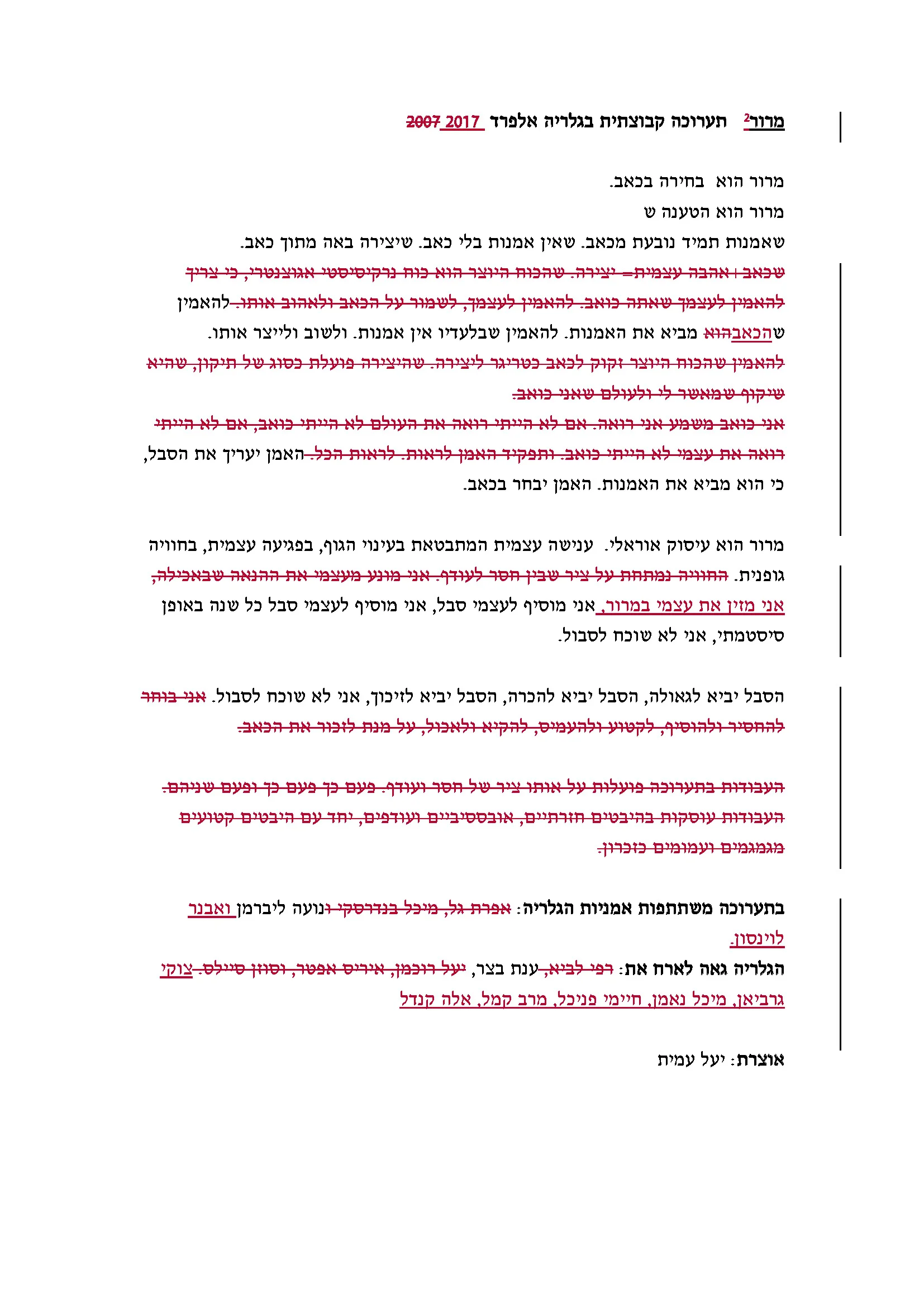 לפני עשור בדיוק נפתחה בגלריה אלפרד הקטנה והצעירה ברחוב פלורנטין, תערוכה בשם 'מרור'. לכבוד עשור לתערוכה מבקשת האוצרת יעל עמית לבחון שוב את רעיון התערוכה ולבנות אותה מחדש.