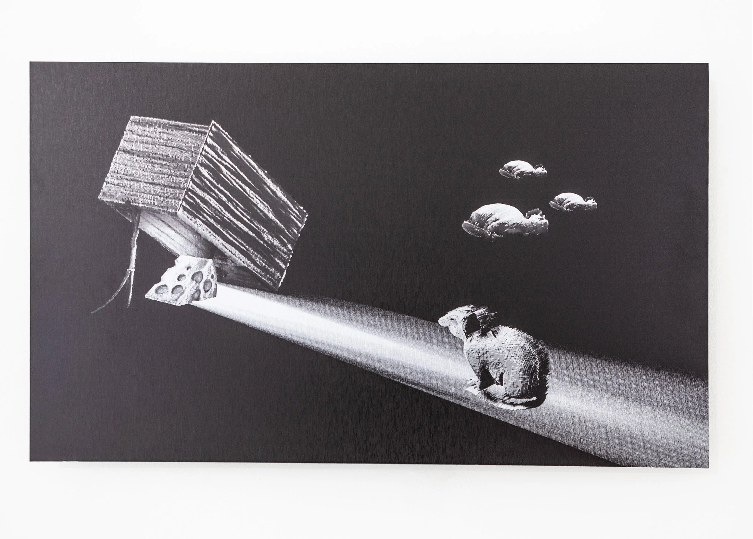 בעוד גאפל מייצר העתקים ללא מקור המעוררים געגוע לימים קדומים, ברק מראש משתמש בחומר גלם דיגיטלי נטול נוסטלגיה. עם זאת, עבודותיו הן גשר המחבר בין 'שם ואז' לבין 'כאן ועכשיו' במטרה לבקר את אופני התקשורת הדלים והמצומצמים, את הסימולקרות ואת הנטייה להגזמה שמובילה לאובדן המשמעות, המוסר והערך בימינו. ב״שלושה עכברושים״ הוא מגדיל ומשכפל את אימוג׳י העכברוש (פעולה שחושפת את מקורו הדיגיטלי של הדימוי) בפורמט המזכיר מבנה של הודעת ווטסאפ. זהו ניסיון אירוני לדמות שיחה בצ׳אט בין תושבי העירייה המבוהלים, אך גם ביקורת של התקשורת השטחית והדיכוטומית בימינו, הנסמכת על דימויים קטנים ומוכפלים. ב״זוהר בחשכה״ הוא מייצר קשר נרטיבי בין אימוג׳י העכבר לבין אימוג׳י מלכודת הגבינה כדי להצביע על הסכנה הטמונה ב״מרוץ העכברים״ המאפיין את החיים בחברה המערבית. האלומניום המוברש, עליו מודפסות שתי העבודות, הוא חומר גלם המשמש ליצירת שלטים מעוצבים לבעלי מקצוע כמו עורכי דין או רואי חשבון. הוא מרמז על תאוות הבצע של תושבי המלין בפרט, ובני האדם בכלל, שממיטה עליהם שוב ושוב אסון.