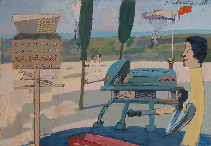 פרטי הדימוי: בוריס יוחבץ ,"Chinese Boxers Descended" , גואש על נייר, 1996